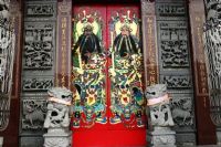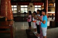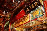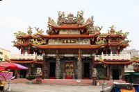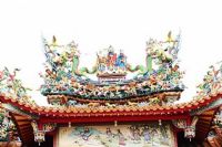 外塭仔「和濟宮」的屋頂剪粘富麗堂皇,交趾陶人物(麒麟、福祿壽、八仙)栩栩如生,讓整個保安宮更添氣派。廟寺屋頂建築於兩端呈現翹的形狀,老師說的這個叫做燕尾式屋脊,廟裡的老伯說只要是道教的廟,供奉的神是正神,就可以把廟屋頂的兩端弄成翹的形狀,如果是那種不是正神,像是自身悟道而擁有許多道友的那種非正神的廟,就不能建築兩端呈現翹的形狀的建築,因為那是便利人們光看建築就能了解那間廟是不是供奉正神的廟。 |