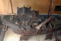 三寮灣東隆宮的王船信仰尚有一個特色,那就是廟內同時供祀二艘永遠駐廟的王船,一木一銅,木船在右殿,銅船在後殿,啟建於民國65年間。銅製王船為全台唯一僅有的泉州式古帆船,水手、船舍雕工精細,栩栩如生,人物造型神態活現,頗具民俗藝術價值。 |